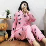 The 2Pcs Pink Feather Print Pajama Set includes a long-sleeve, relaxed-fit top and perfectly tailored trousers, both featuring delicate feather designs in a rich pink hue that radiates charm. The smooth, breathable fabric is lightweight enough for the UAE’s warm evenings while still cozy for indoor air-conditioned settings. If you love versatile styles, this set also channels the luxurious appeal of Hot Pink feather pajamas in 2Pcs, making it a standout piece in your nightwear wardrobe.